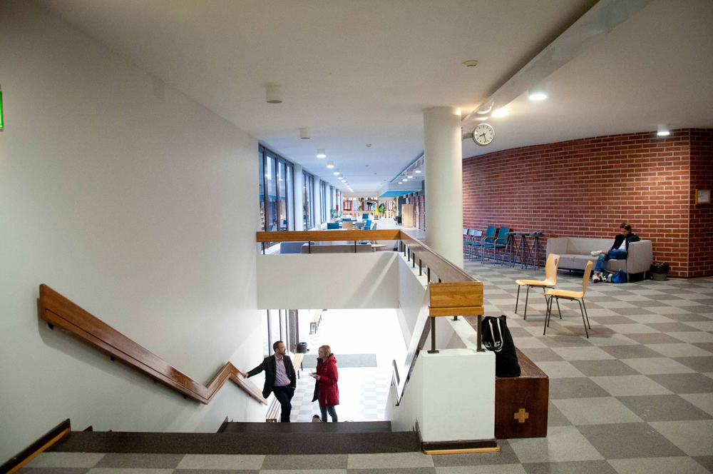Norsenin yläasteen rehtori Johannes Nygren vastasi hymyillen kysymyksiin, joita tilat ja koulu herättivät. Hän näytti jo tottuneen uuteen rakennukseen ja vaikutti tyytyväiseltä tiloihin. Meihin ensi vuonna evakuoituviin uteliaisiin kuvataidelukion opiskelijoihin hän suhtautui ystävällisesti.