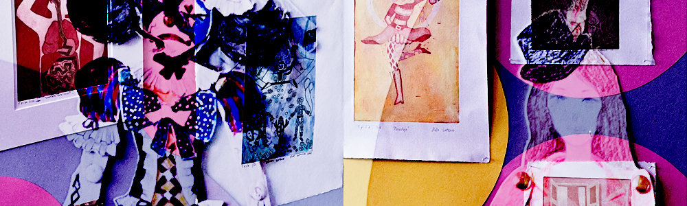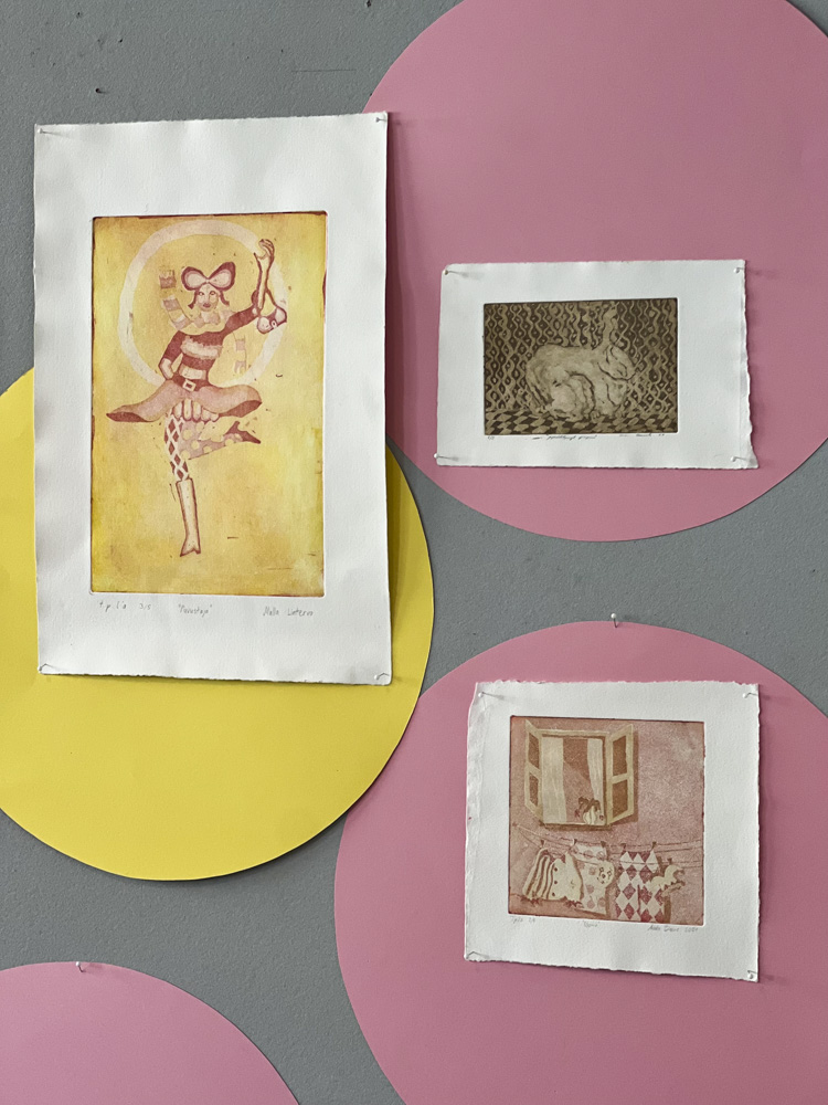 Grafiikanvedoksia, pukusuunnittelukurssin marionetteja sekä valokuvia koulun Aulagallerian näyttelyssä loka–marraskuussa.